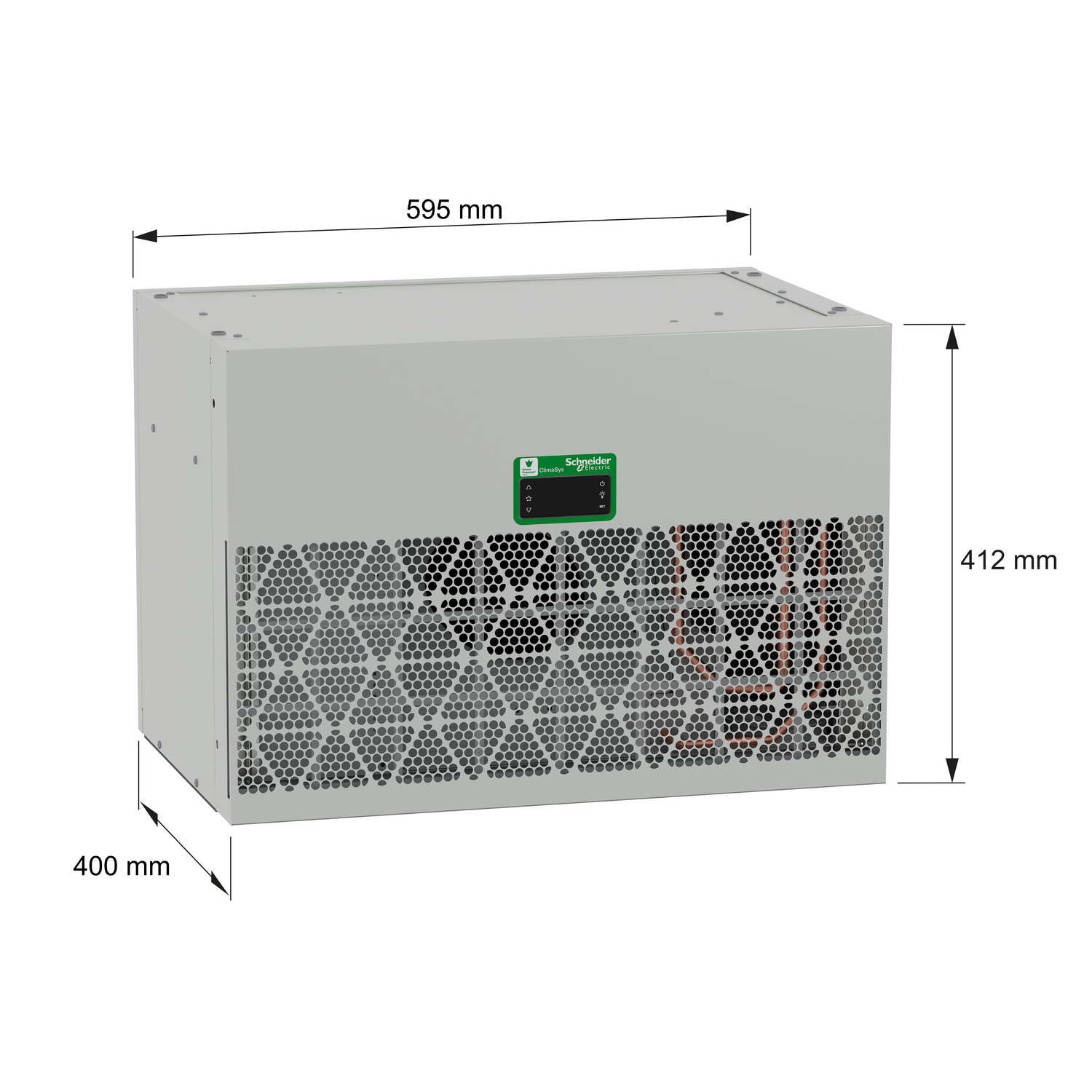 Description: Schneider Electric, NSYCU1K52P4RDG, Cooling Unit, 400, 460 V, 3 A, 1550 W Power, 50, 60 Hz Frequency, IP54 Enclosure, 850 cu-m/hr Internal circuit, 850 cu-m/hr External circuit Flow Rate, Electronic Control, 20 to 50 deg C, Roof Mounting, Steel, Gray, 16.2 in H x 23.4 in W x 15.6 in D Dimensions
